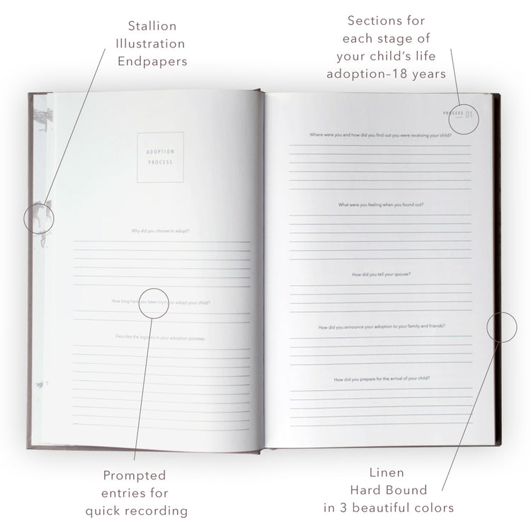 Our adoption journals are designed specifically to capture the unique adoption story of each child and family. These journals start with prompts relating to the adoption process, placement, conversations about being adopted, and 18 years of childhood memories of these children.